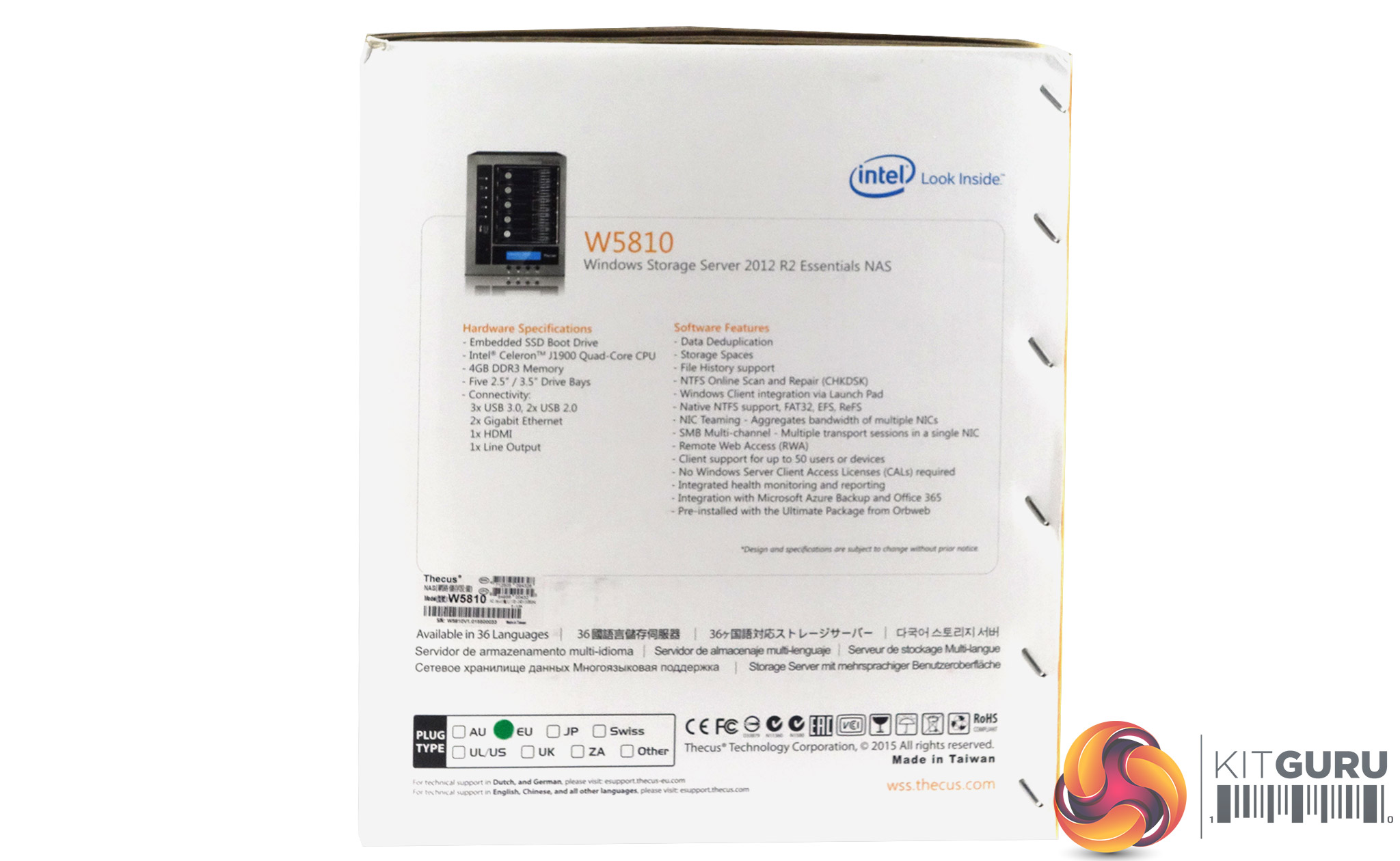 One glance at the front and back of the box that the W5810 comes in, finished in a natty shade of orange, leaves you in no doubt that this is a Window's based product. Along with the model number on the front here is a note about the number of clients supported by the Windows Storage Server 2012 R2 Essentials OS and a list of the devices features.