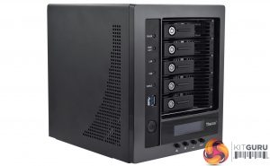 To the left of the drive bay are five vertically stacked indicator LEDs, one of the three USB 3.0 ports and the power button. For the indicator LEDs, Thecus has forsaken any fancy colours and gone with plain white although if there is a system error the system LED changes to red. From the top down the five indicators are; power, two LAN, USB activity and system status.