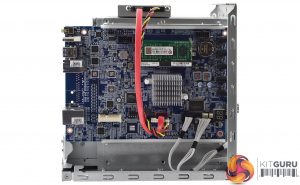 Sitting in the middle of the board is an Intel Celeron J1900 Quad-Core processor which runs at 2.00GHz (burst up to 2.42GHz). With a TDP of just 10W, the 22nm J1900 only needs passive cooling. Sitting above the CPU are a pair of SO-DIMM slots. The W5810 comes with 4GB of DDR3 (Transcend 699086-1076 DDR3L-1600 in the review sample) as standard installed in one slot but should you need more memory, 8GB is the maximum the W5810 supports.
