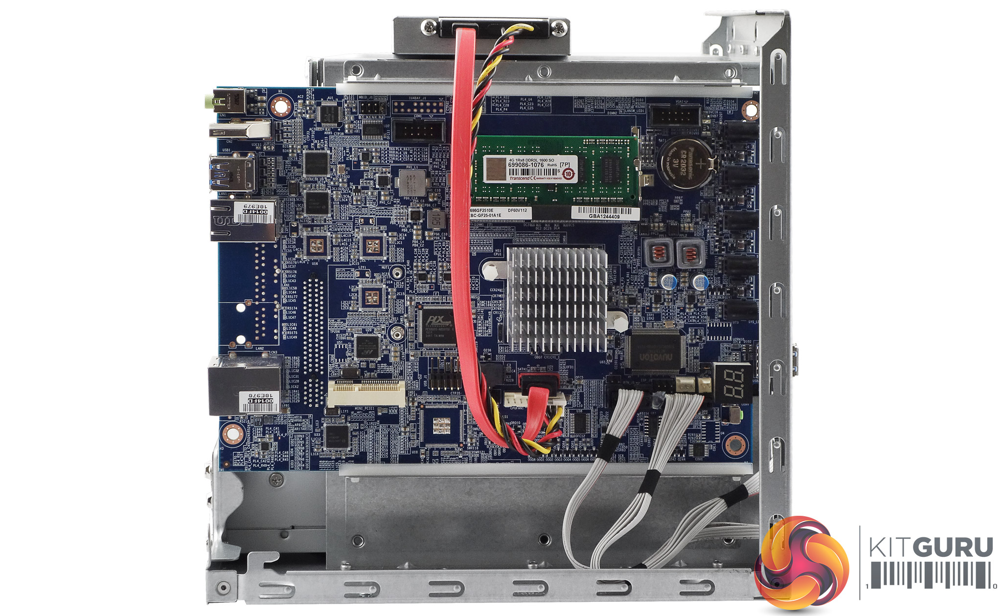 The Celeron J1900 provides support for the two USB 2.0 and one of the three USB 3.0 ports, the other two being looked after by an Asmedia AGM1042A IC. A pair of Intel WGI21controllers look after the two Ethernet ports while a Realtek ALC662 provides 5.1 audio support. The four SATA interfaces are controlled by a Marvell 88SE9215-NAA2 chip.