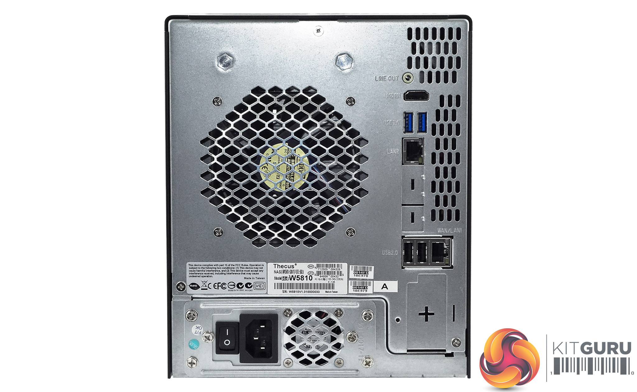 To the left of the drive bay are five vertically stacked indicator LEDs, one of the three USB 3.0 ports and the power button. For the indicator LEDs, Thecus has forsaken any fancy colours and gone with plain white although if there is a system error the system LED changes to red. From the top down the five indicators are; power, two LAN, USB activity and system status.