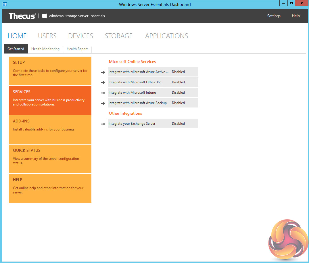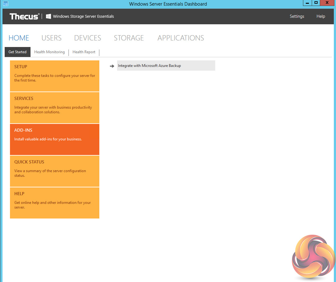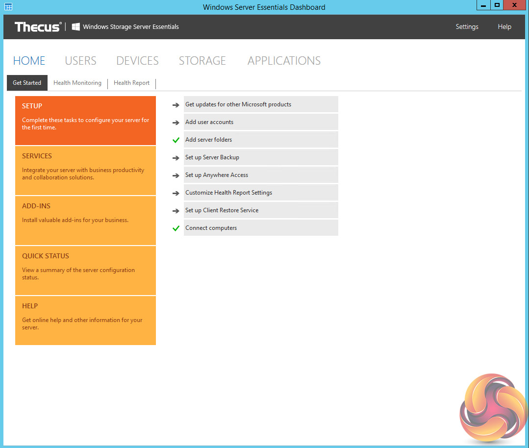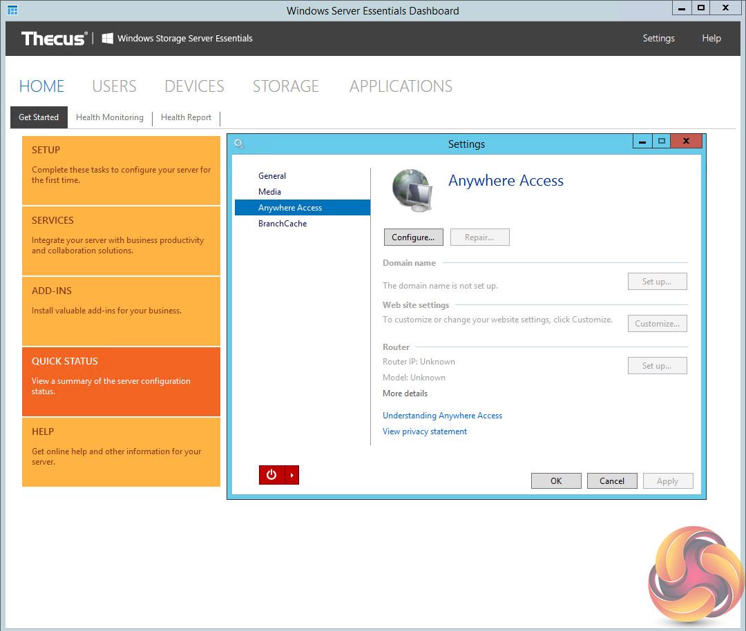 Clicking on the Getting Started tab reveals a block of five options; Setup, Services. Addins, Quick Status, and Help. Under Settings there are eight further submenus that allow setting up Windows Update, adding users and server folders, configure data backups and the Client Restore service which can connect other computers to the W5810. Microsoft's Anywhere Access is also offered in this section.