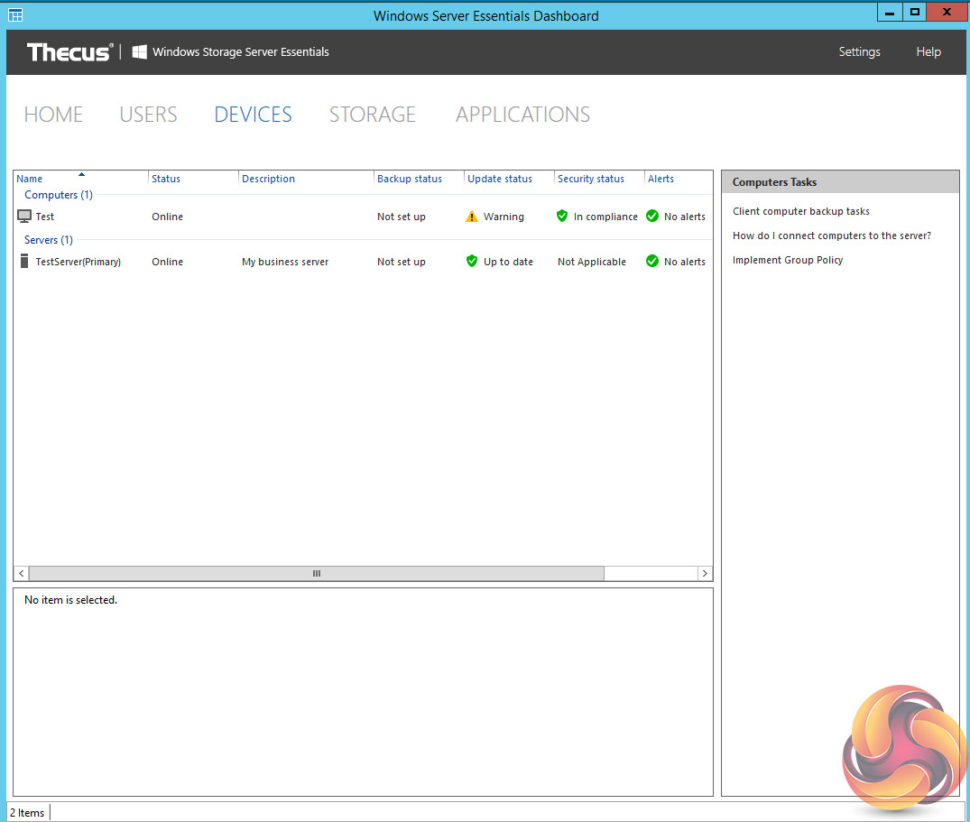 The Devices page lists all the computers and devices connected to the server. The Application page links out to Microsoft's Pinpoint page. Pinpoint is the marketplace for Server 2012 Essentials allowing business users to find useful apps and services.