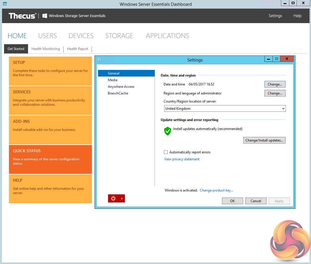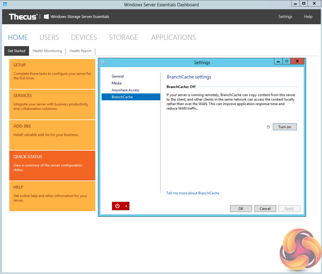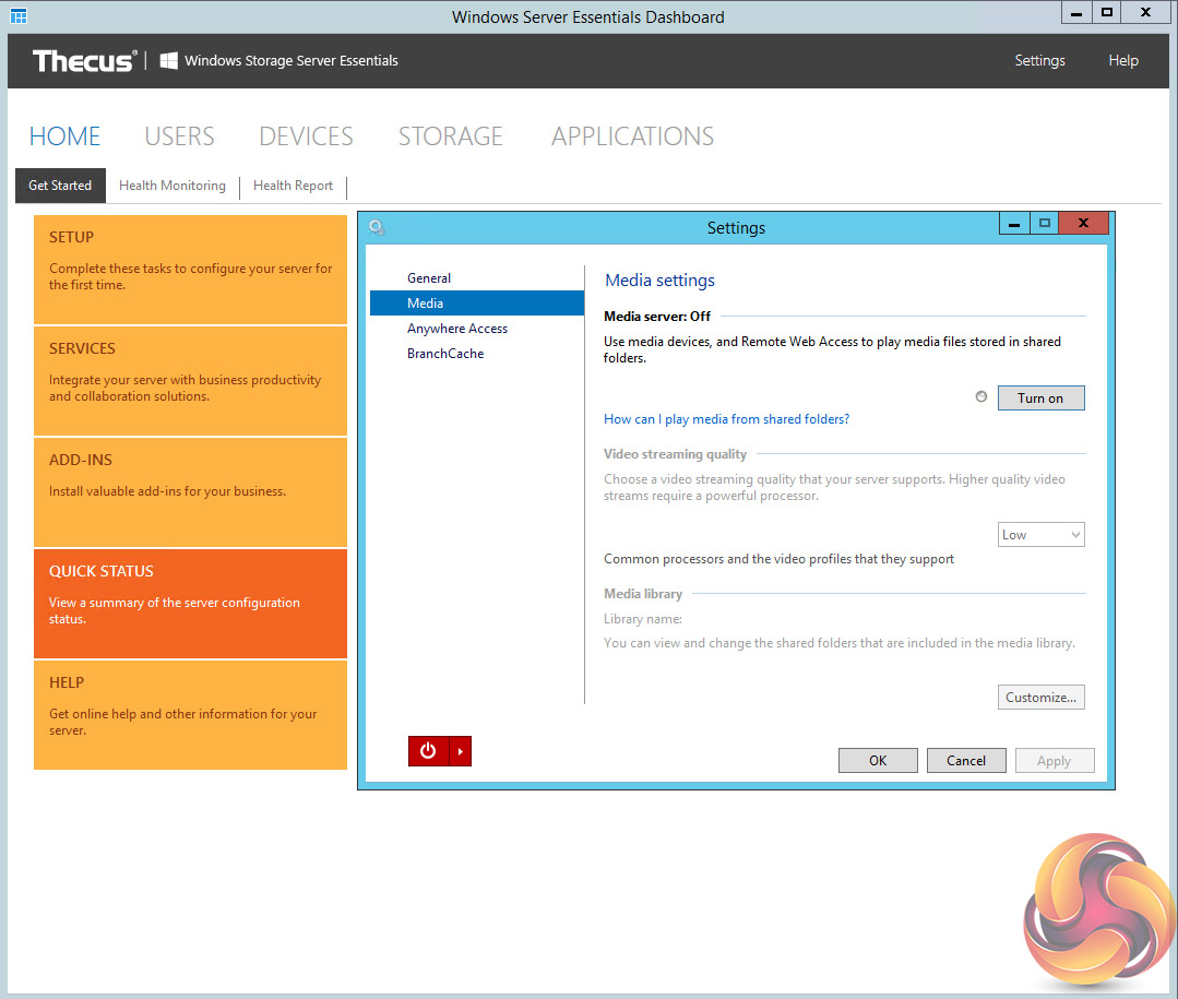 The Media section allows the Media server to be turned on and off, change video streaming quality and view contents of the media library. The last two sections allow the setting up and/or change settings of Anywhere Access and BranchCache. It also has a power icon to either shut down or restart the W5810.