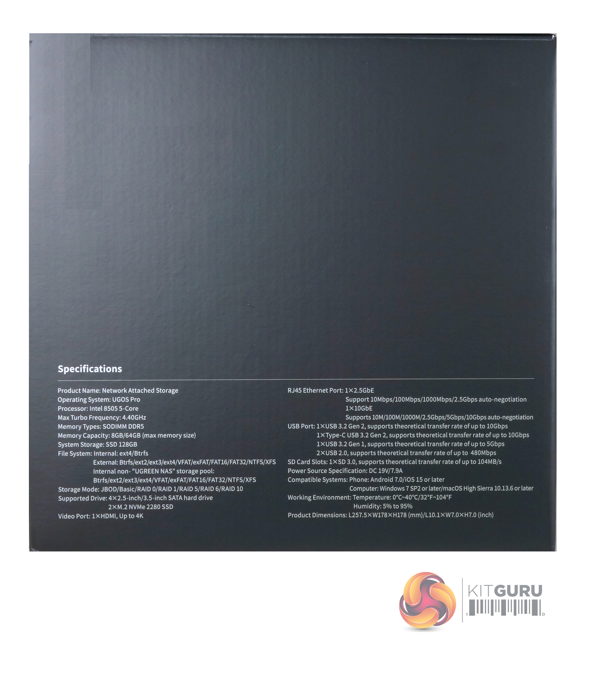The NASync DXP4800 Plus comes in a compact box. The front of the box has a large image of the NAS on it. The rear of the box has another smaller image of the unit under which there is a row of icons displaying some of its features; 5-core Intel Processor, Fully featured Docker, Virtual Machine Hosting, Smart Photo, Home Entertainment centre, Data safeguard, exclusive operating system and Synchronization and backup.