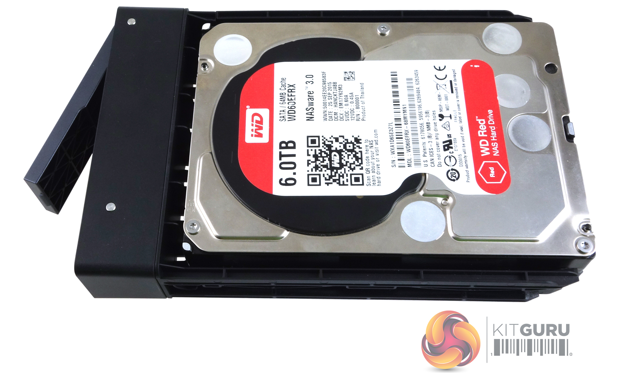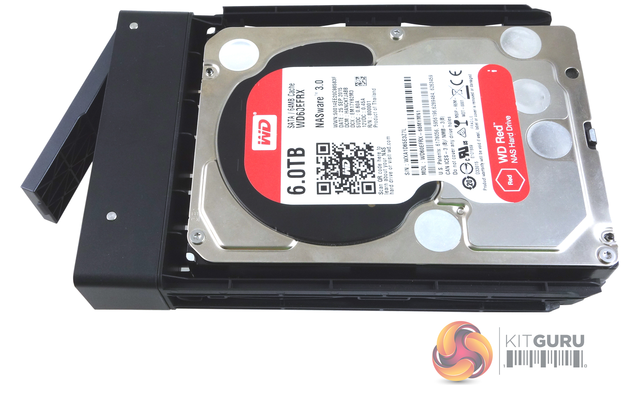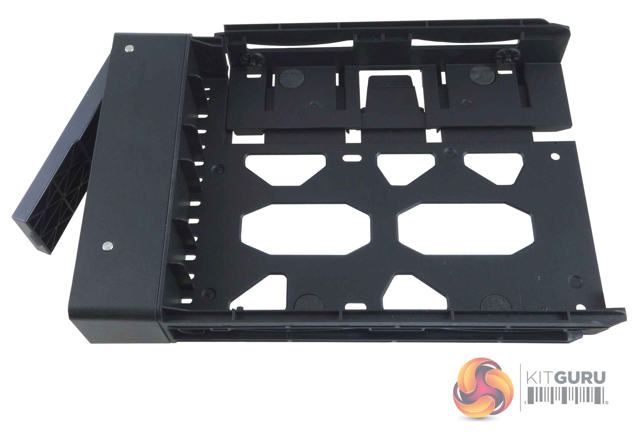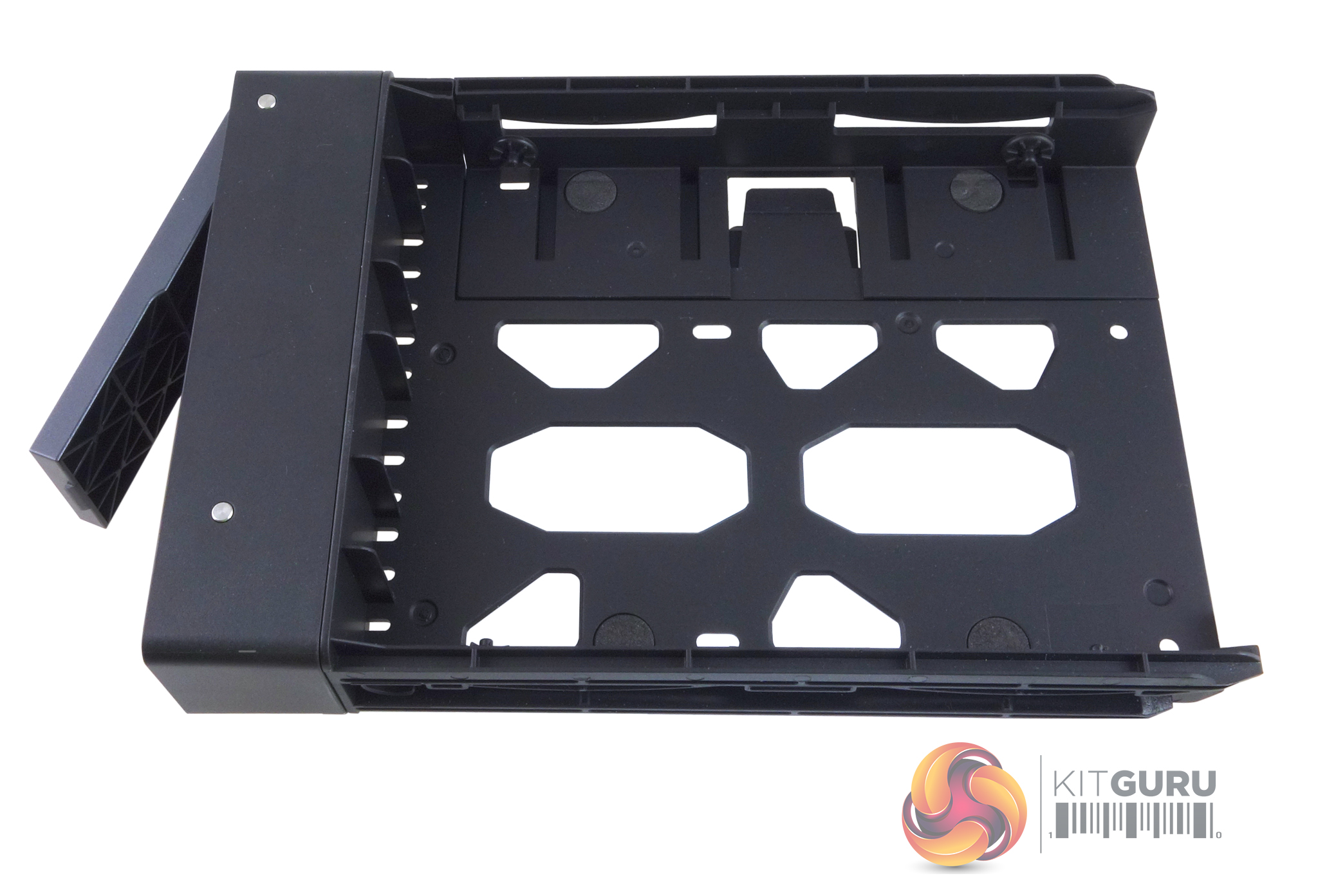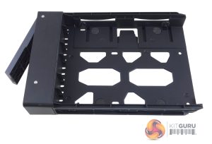 The 3.5-inch drive trays are tool-free and use a novel approach to securing the drives in place. Releasing a latch on the base of the tray allows the side to slide out, the drives positioned on the pegs in the tray sides and then the sliding part is slid back in place to lock the drive. If you want to use 2.5in drives then these have to be fixed in place with screws (supplied in the box bundle) in the base of the tray.