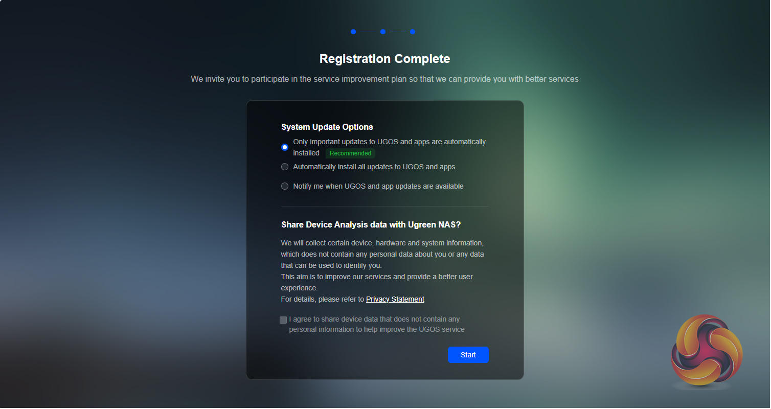 The setup is via an easy-to-follow wizard allowing you to set up an admin account, the way updates are dealt with and the Ugreen cloud service and the whole setup takes hardly any time to get up and running.