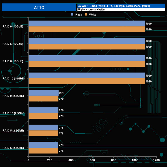 We ran the ATTO benchmark on the DXP4800Plus at both 2.5GbE and at 10GbE and it is remarkably consistent at both speeds through all the tested RAID arrays.