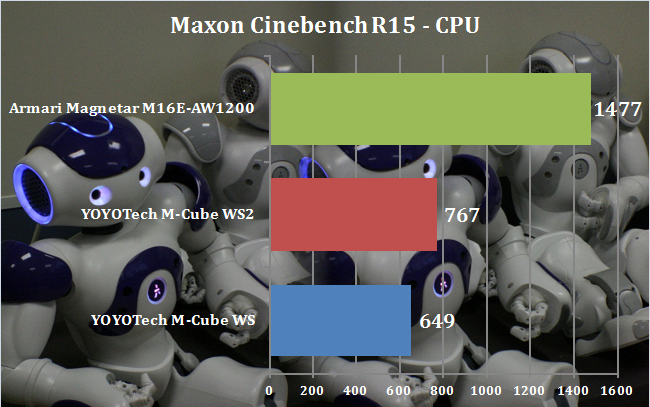 Results in the latest version of Maxon Cinebench parallel those from the previous version, with the Armari's ten 3GHz cores paying huge dividends for rendering, giving it twice the performance of the YOYOTech M-Cube WS2. As before, the AMD FirePro W8100 is ahead of the NVIDIA Quadro K5000, although it's not a complete annihilation.