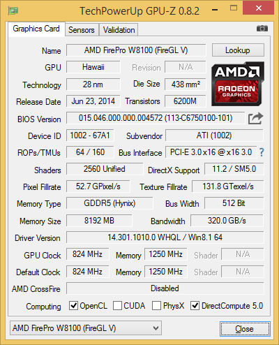 The W8100 sports 2,560 Stream Processors, and a 824MHz core frequency. Most significantly, it incorporates a 8GB GDDR5 frame buffer on a 1,250MHz, 512-bit bus, providing a huge 320GB/sec bandwidth. This makes it noticeably better endowed than the NVIDIA Quadro K4200 with which it competes that only sports 4GB of GDDR5, with the Quadro K5200 costing around twice as much. Performance is competitive, and the 8GB of frame buffer could be particularly useful as texture maps increase in detail and size.