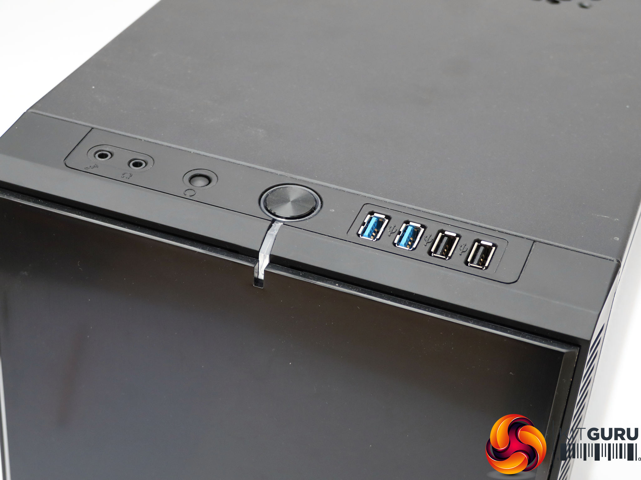 There is a fan vent on the side, but the space intended for a water cooling radiator is on the top. The front is completely smooth and featureless, with the power and reset buttons on the top at the front, alongside four USB ports and minijacks for headphones and a microphone. This is further evidence that a floor-standing position is intended.