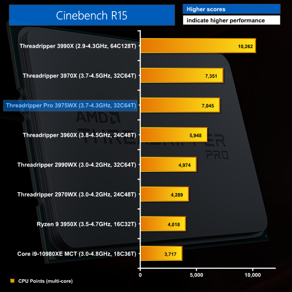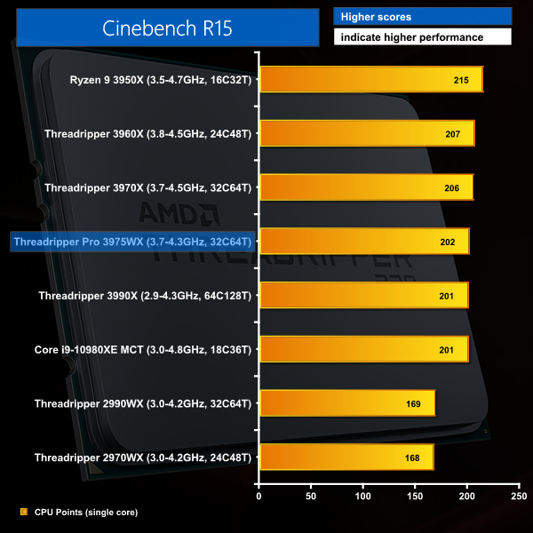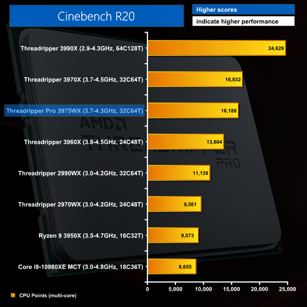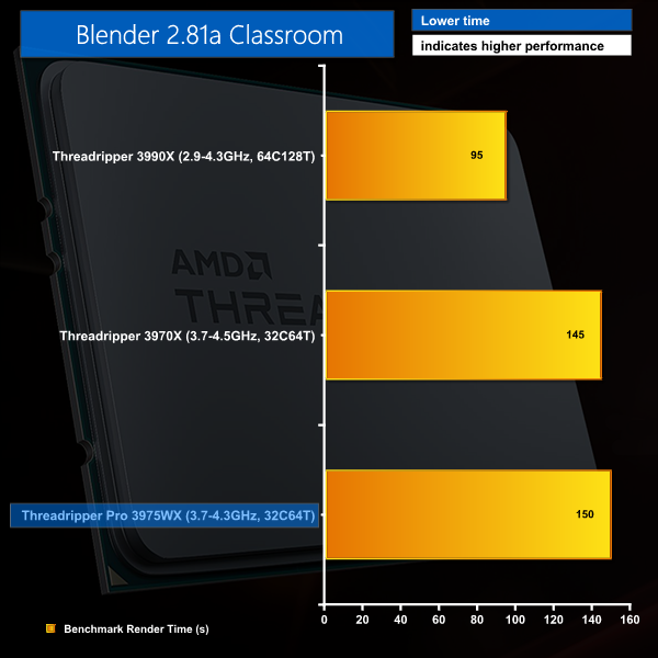 These runs of Cinebench and Blender demonstrate clearly that Threadripper Pro Pro 3975WX runs at 4.25GHz-4.3GHz on a single thread and at 3.70GHz-3.75GHz on all cores, with the result it is consistently beaten by the 32-core Threadripper 3970X. If you are looking for straightforward CPU grunt then Threadripper Pro is a small step backwards from Threadripper.
