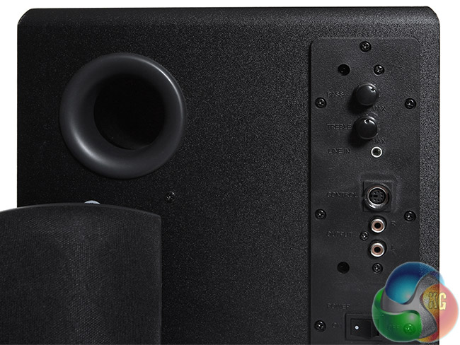The connections on the rear are simple enough, with a power button at the base, connection ports for the remote and the satellites – as well as a line in.