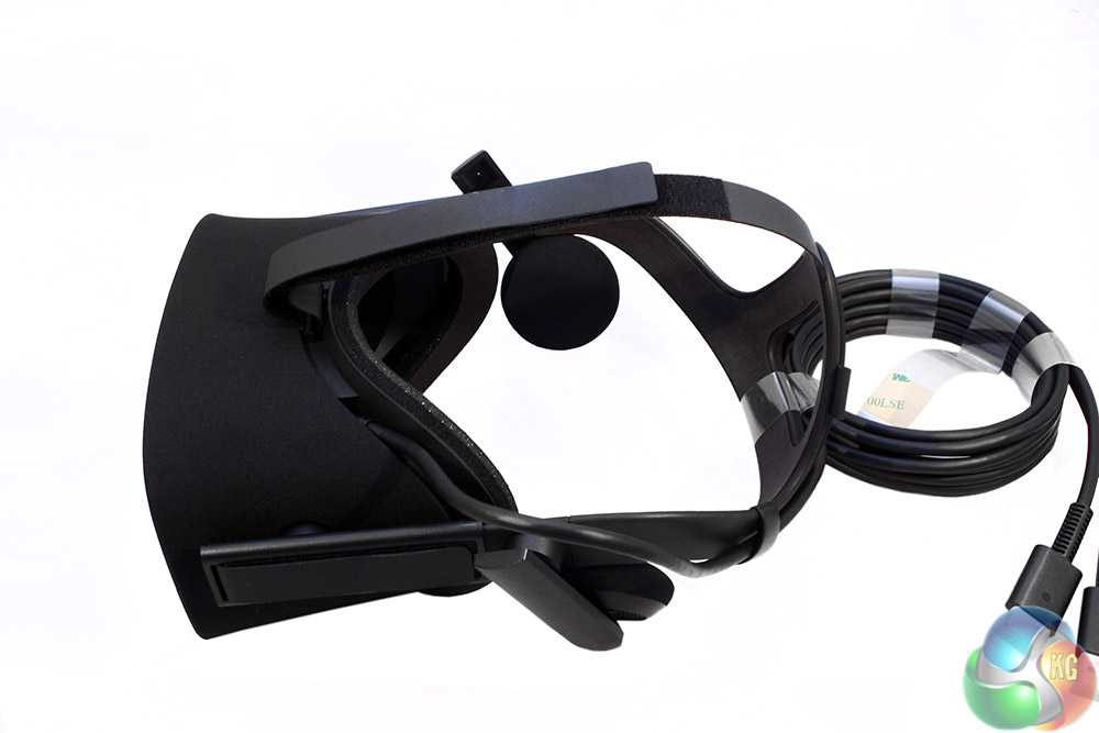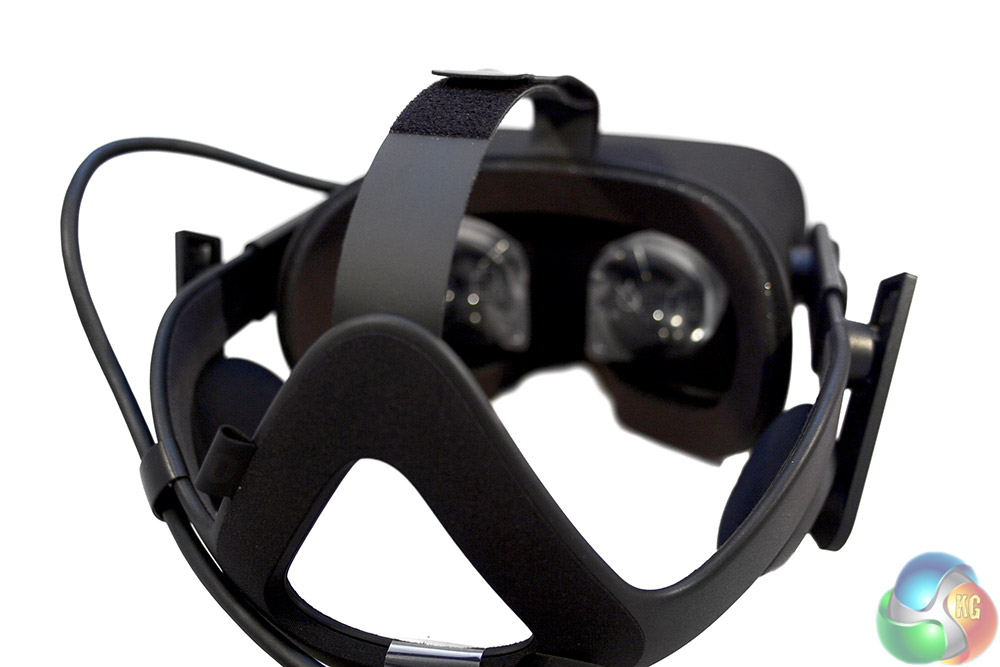 Another big change between the CV1 and previous developer kits, is the headband. This Rift uses a similar over the head strap, with velcro adjustments, but culminates in a triangular strap which sits over the ridge at the back of your head.