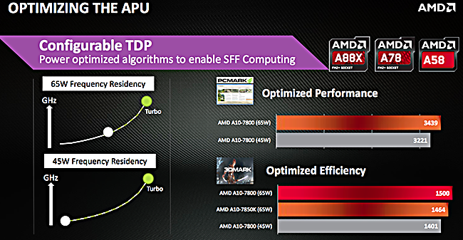 The other point that AMD is making in these charts is that when A10-7800 is throttled from 65W to 45W the 3D Mark score only falls from 1,500 marks to 1,401 marks. That is a seven percent drop in performance for a 30 percent drop in power. I know that TDP and power draw are not one and the same thing but it makes me wonder why AMD didn't take the plunge and release a 45W part.