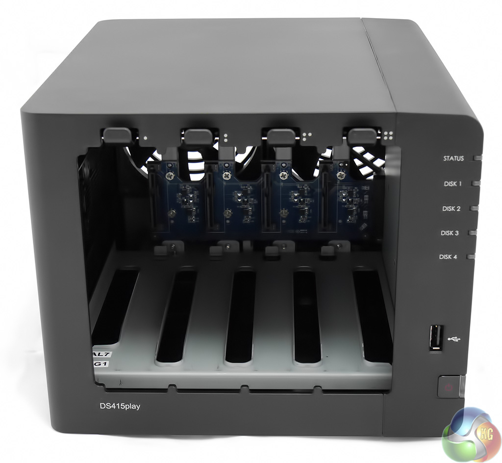 With the four caddies removed you are left with an expensive box. At the back of the NAS you can see the SATA riser card and the motherboard is just about visible through the slots at the bottom of the case. I would have loved to pull the DS415play to pieces to photograph the Atom processor however the pieces fit together very snugly and I got the distinct impression I would break something if I started pulling at the panels.