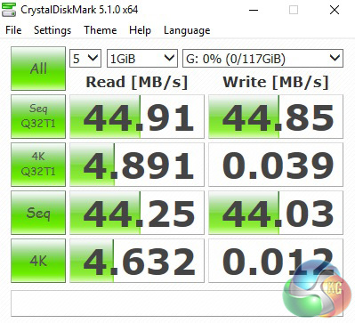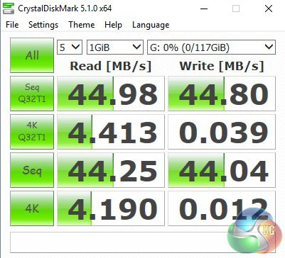 USB 2.0 performance is limited, with speeds hovering just under the 45 MB/s mark for both read and write. This is quite the performance hit compared to USB 3.0 but should still hold up well against other USB 2.0 drives.