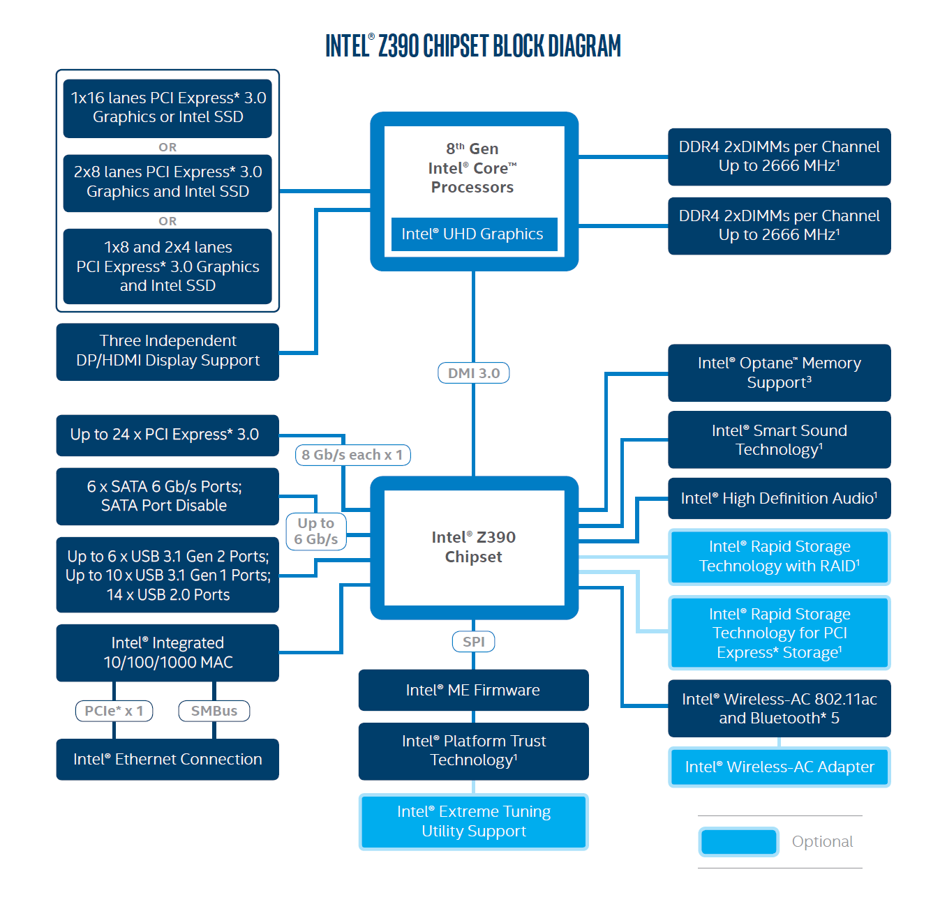 Unlike the Z370, the Z390 chipset supports up to six USB 3.1 Gen 2 ports (10 Gbps), ten USB 3.1 Gen 1 (5 Gbps) ports or fourteen USB 2.0 ports. Twenty-four PCIe 3.0 lanes are included, as are RAID 0, 1 and 5 with PCIe NVMe SSDs.