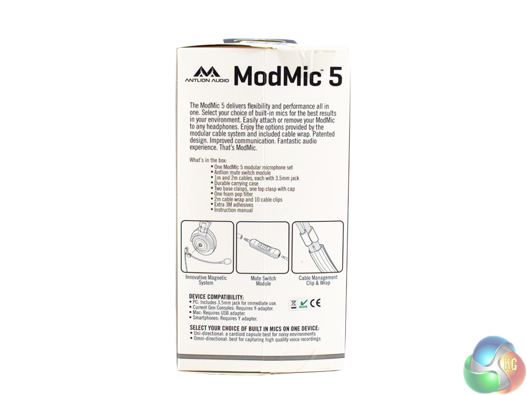 The Antlion Audio ModMic 5 arrives in a small, white box. On the front there is an image of the mic as well as a few key features of the product.