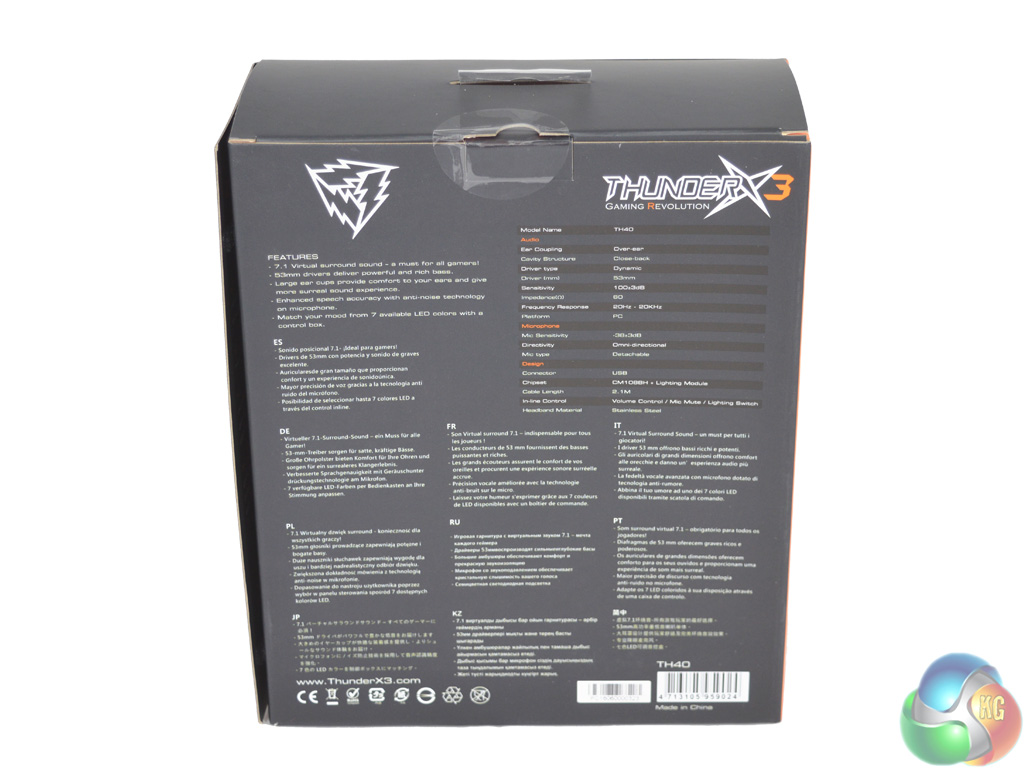 The ThunderX3 TH40 by Aerocool ships in a dark grey box, with a large product image on the front which immediately makes a feature of the LED earcups.