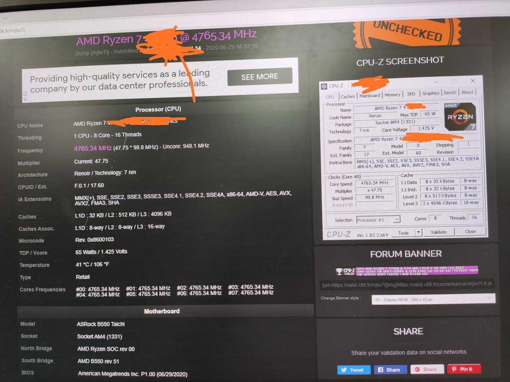 The database entry was first shared by ITCooker, showing an overclocked sample of the AMD Ryzen 7 4700G on CPU-Z Validator. This sample was overclocked to an all-core frequency of 4.765GHz with a voltage of 1.425V, an increase of about 7% to the reported boost clock frequency of 4.4GHz. Additionally, a 4.9GHz single-core overclock was also achieved.