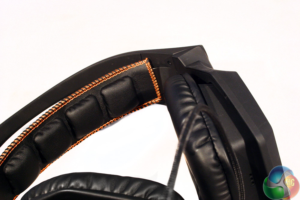The headband is a nice mix of black leather and orange stitching, which gives it a real quality look and feel. The fact that the headband and plastic frame are separate is testament to its ability to take some damage – as it keeps everything as flexible as possible.