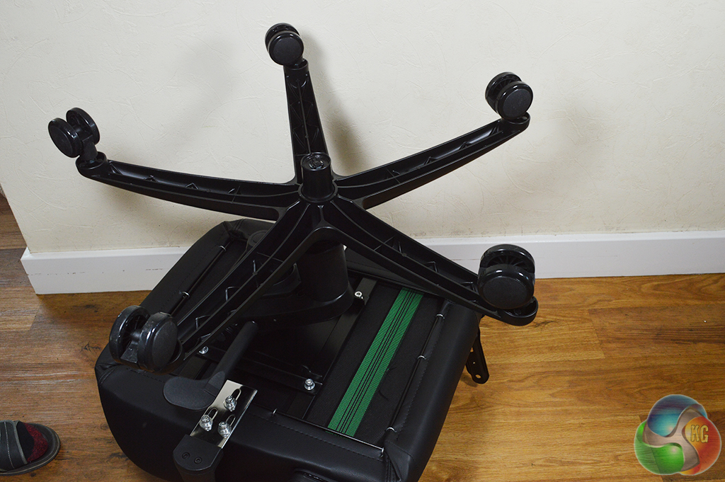 For this build, the instructions tell us to start off with the base seat. Turn it upside down so that it sits on the arm rests, align the gas lift with the screw holes and secure with the four screws provided.
