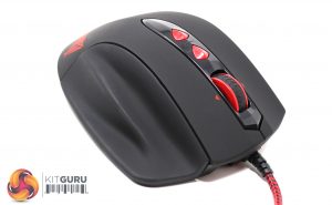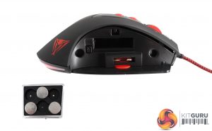 Only six of the seven 4.9 gram weights can be used at any given time, increasing the mouse from 193 grams to a total of 222.4 grams overall. The weights are placed into the mouse via a tray that is only accessible through unlocking a switch on the bottom.