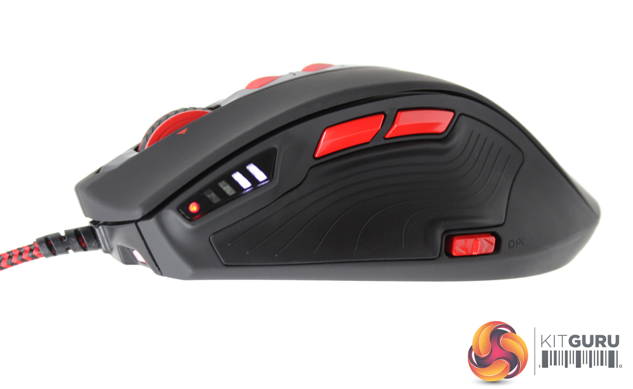 The left side of the mouse shows the LED indicator in more detail, alongside the DPI switch and the traditional back and forward buttons, which can be changed to suit almost any function from within the Viper software. The front of the mouse shows off two RGB LEDs that are linked to the profile indicator and a third LED at the back.