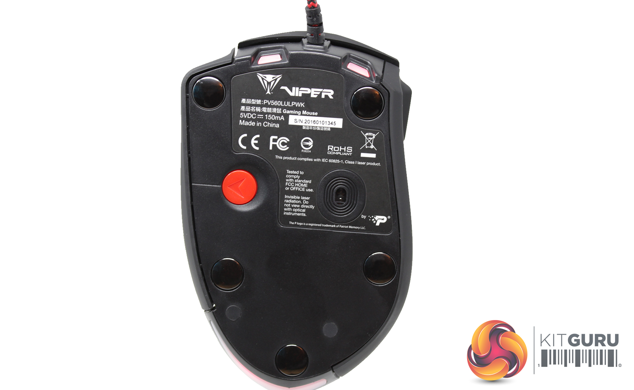 All of the relevant product information can be found on the underside, above the Avago ADNS9800 laser sensor. Patriot has continued its trend of ceramic pads to help the mouse glide smoothly along a variety of surfaces. Lastly, the red button acts as a switch to remove the interchangeable pink rest to the right of the mouse, giving access to the weights tray.