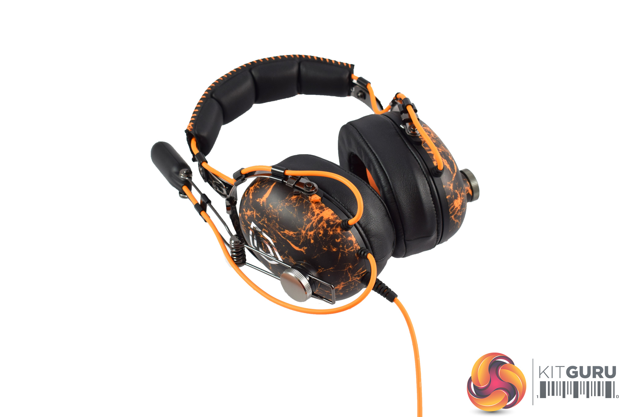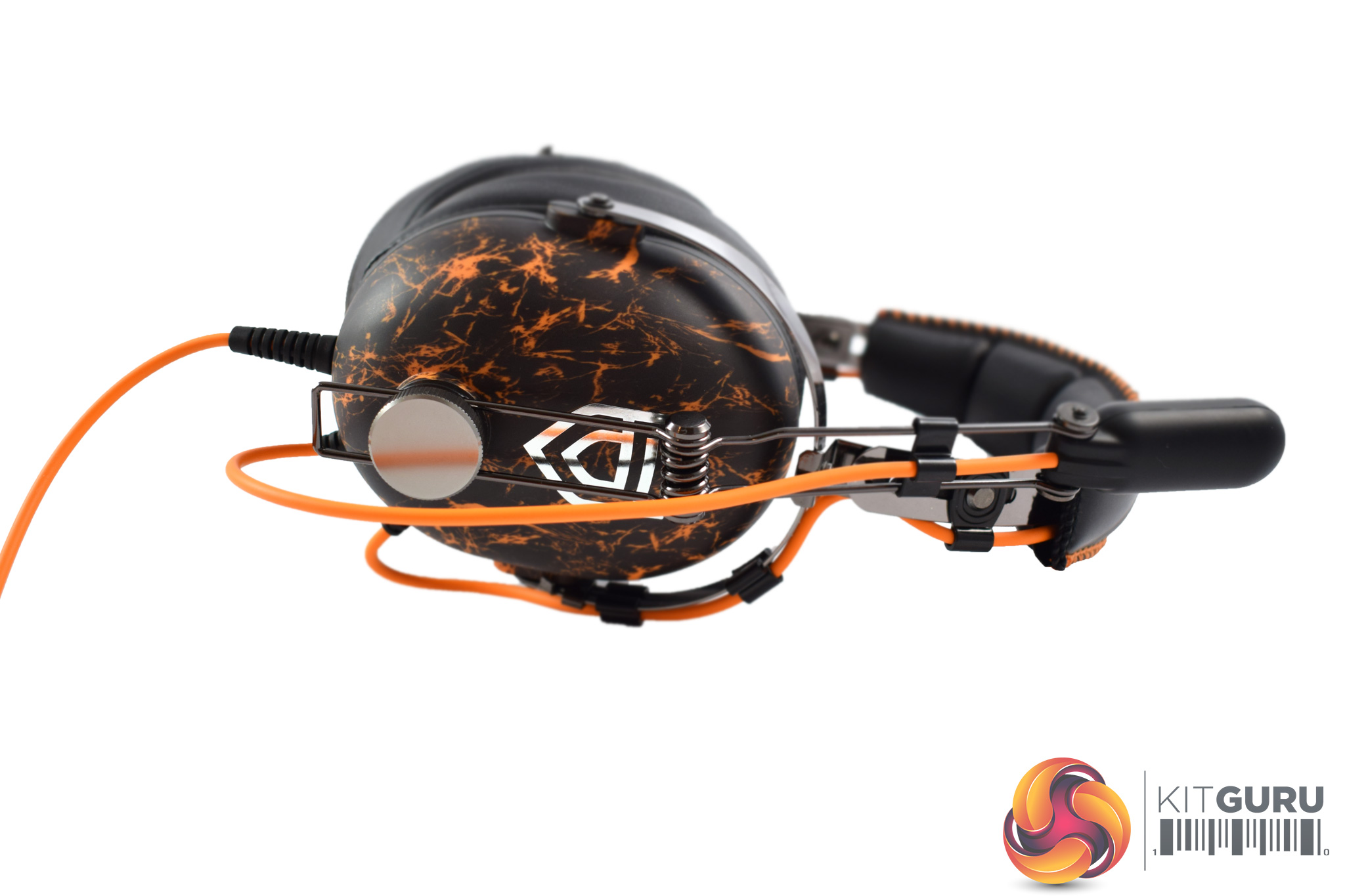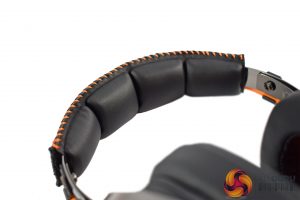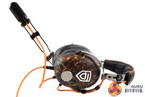 Starting with the earcups, we can immediately spot the Penta-inspired design with its bold, orange accenting, while the Penta logo is also placed on the back of the earcups. These earcups use a closed-back design, too, which is worth noting. Lastly, as you can see in the image above, the right earcup features an on-ear volume wheel.