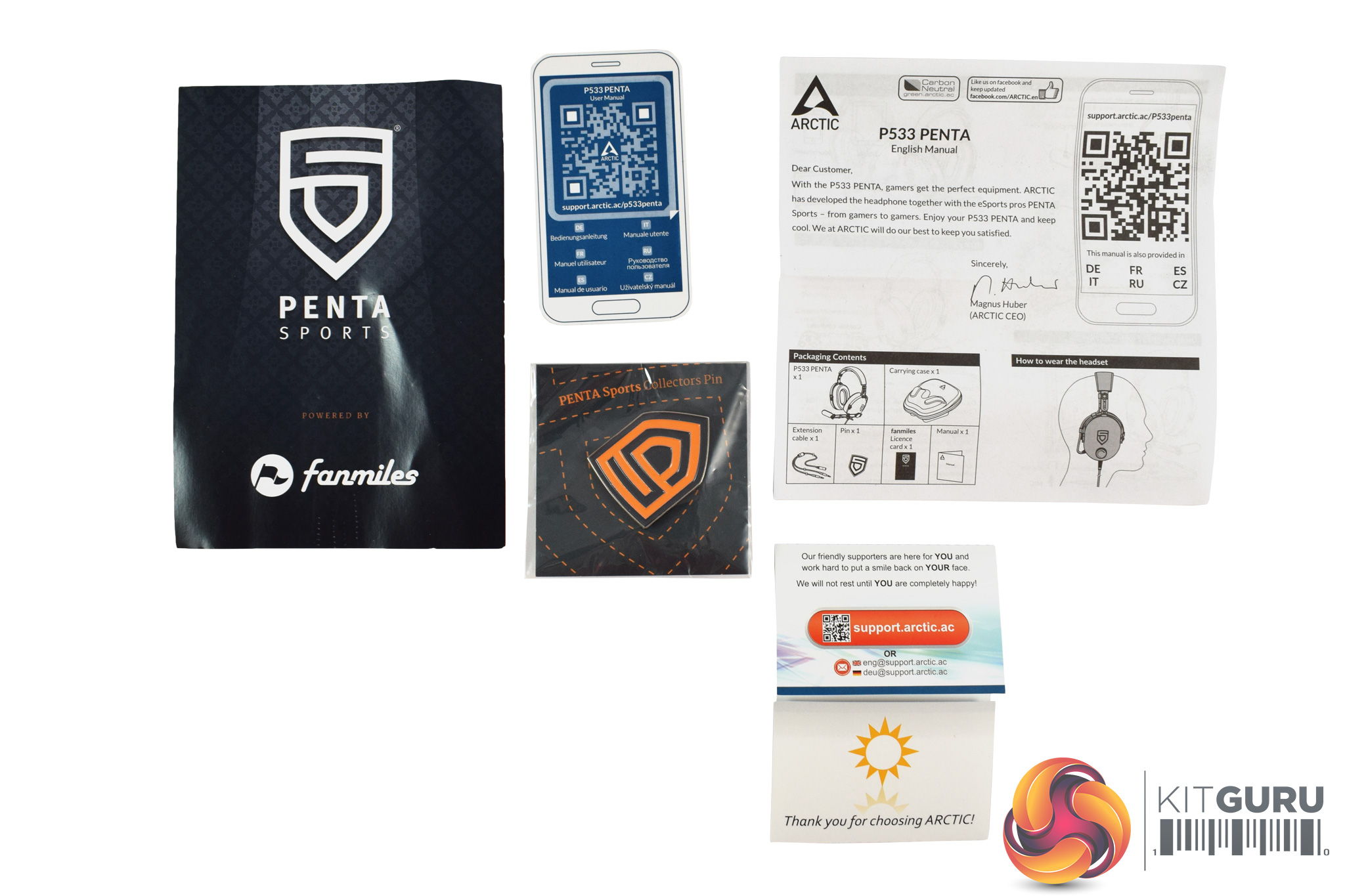 Inside the box, we find a few different manuals and booklets. There is a quick-start guide, an Arctic greeting card, a fanmiles license code, a Penta collectors pin and a QRS code which links to another user manual.