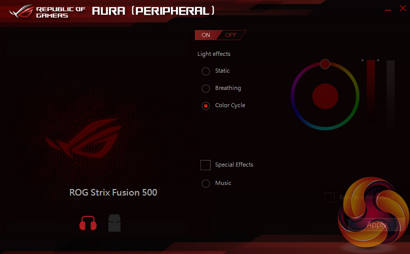 There's only one small piece of software for the Fusion 500 and that is to control the lighting. You can choose between static, breathing and colour cycle effects, while there is also a special music mode where the lighting reacts to any music being played.