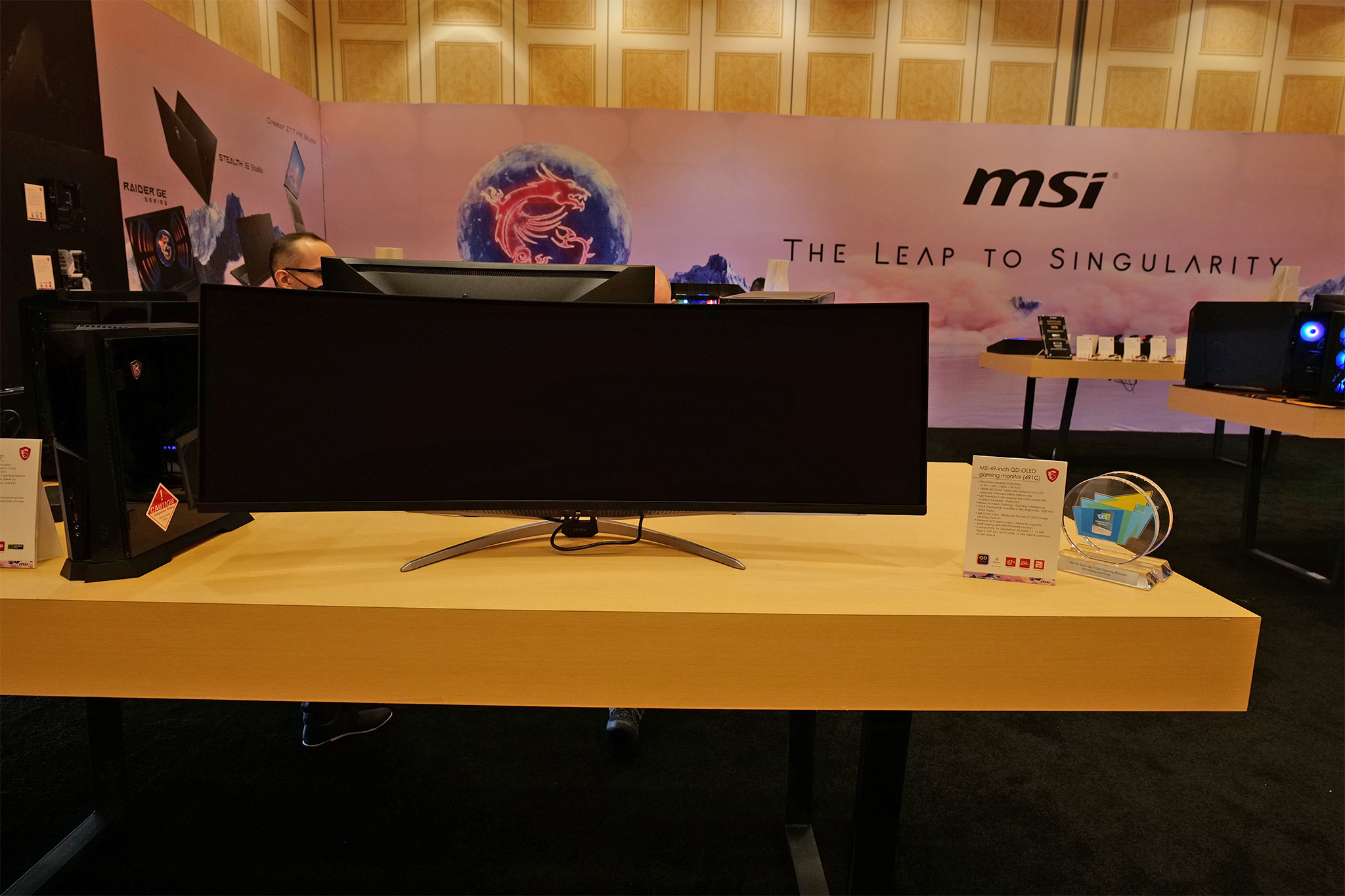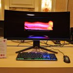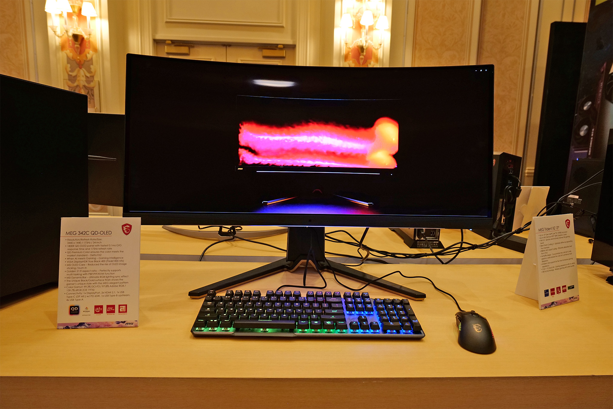 There were a couple of high-end QD-OLED monitors on show too, the first being the 175Hz 3440×1440 MEG 342C. With a suggested price of around $800, making this look like very good value considering the technology, it also sports an ambient light bar underneath the panel itself which can match the colours of whatever is being displayed on screen, without the need for any software.