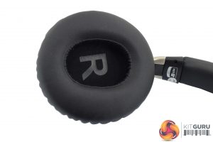 Turning to the inside of the ear cups, we get a look at the ear cushions. These are covered with faux-leather and are not removable. A big ‘R' or ‘L' is printed on the inside of the cup to let you know which way round to wear the headphone.