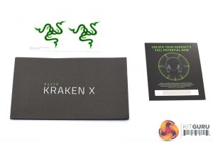 We also find a pair of Razer stickers alongside a quick-start guide. The last little leaflet is in fact the license code for the 7.1 virtual surround sound I mentioned on the first page. Owners of both the Kraken X and the new Kraken (2019) get access to this software, and if a license code didn’t come in the box, you can get one by registering your headset on Razer’s website.