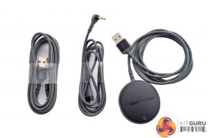 Those accessories are essentially three different cables. From left to right we have: 1x charging cable, 1x 3.5mm cable (for use with a phone/console) and 1x USB wireless receiver (for use with your PC/Mac).
