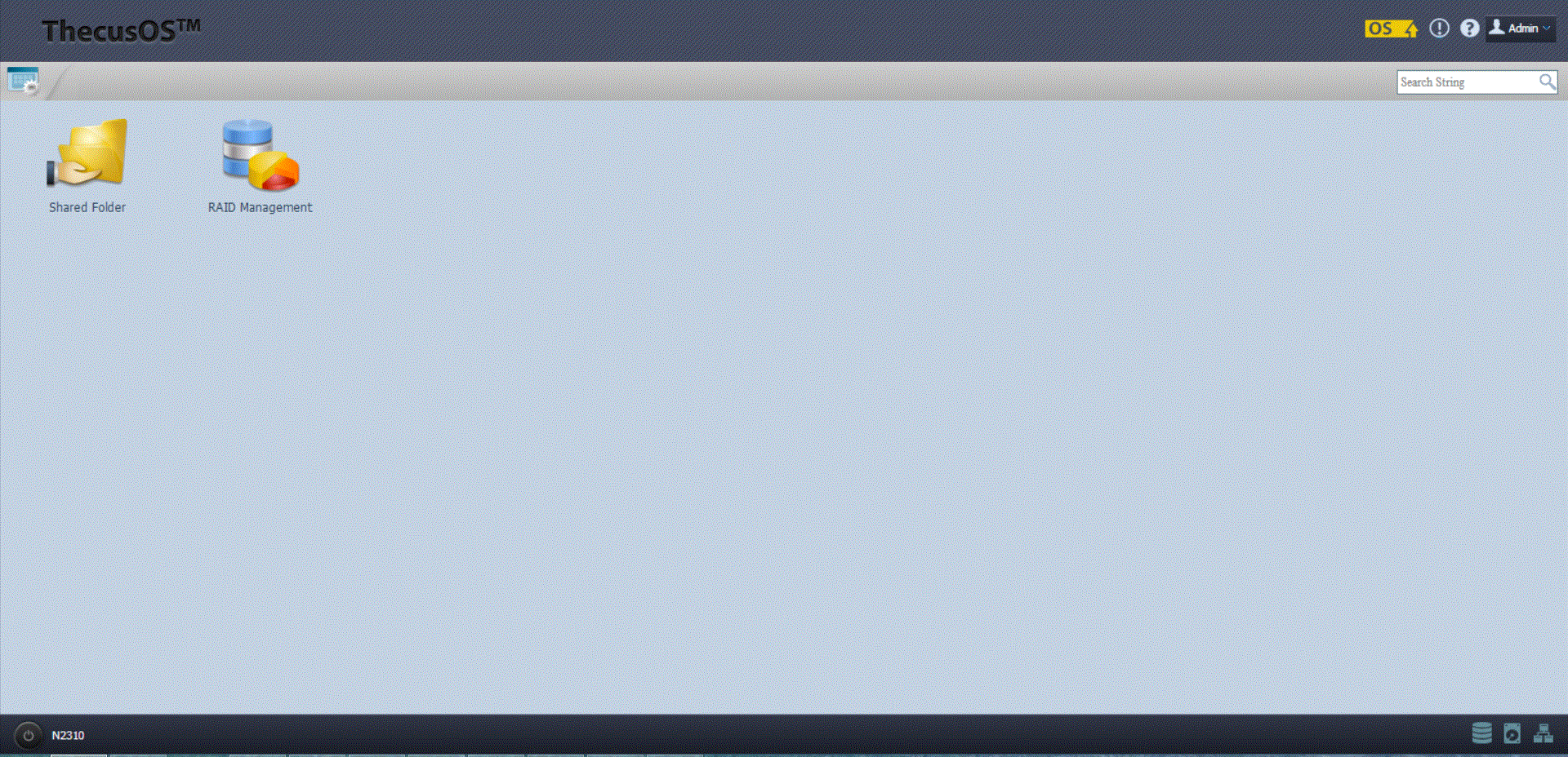 After accessing the OS, we are greeted by a simple screen with icons to access the RAID configuration and to access the Shared folder through the web interface. To access the main control panel we click on the icon in the top left hand corner.