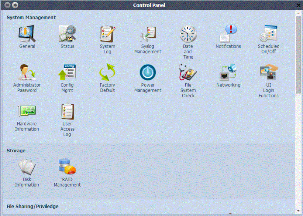 This brings up a large control panel which lets you access all the features of the OS. The first section deals with managing the settings and functions of the server itself. There is also a storage section which lets you access RAID management and Disk Information.