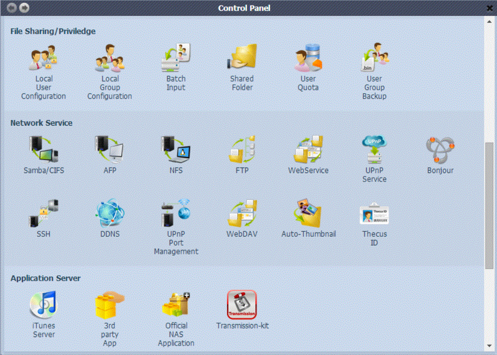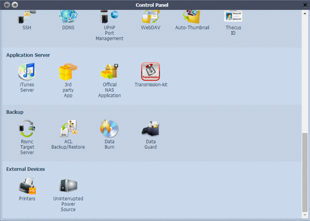 The next three sections handle File Sharing options, Network Services and the Application Server. Some of the key features include FTP support and 3rd party application support, as well as an inbuilt Bittorrent client ‘Transmission'.