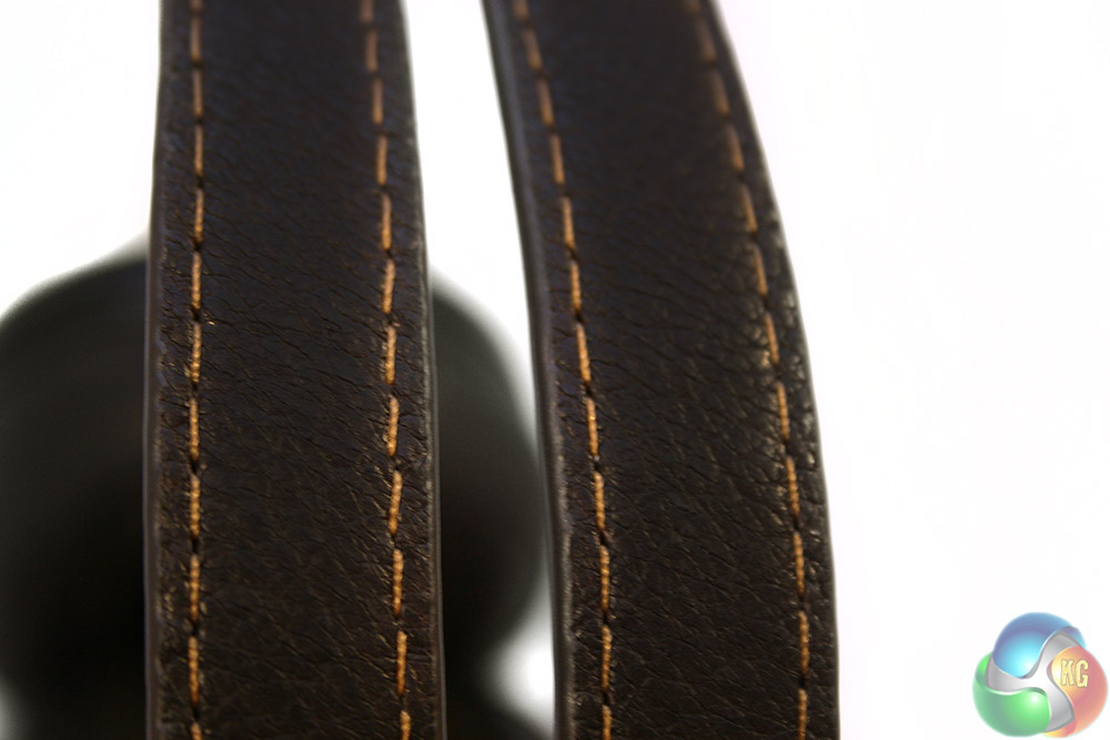 Up close, the exterior of the ear cups are a beige colour with a greenish tinge. The paint job is pearlescent so has that slightly sparkly look to it, while the earcup material is a dark brown leather, with black stitching.