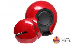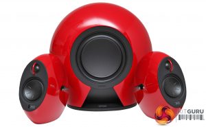 The satellites have a ¾” tweeter and 3 inch driver giving you 38 watts. The ‘thunk’ comes from the big, round subwoofer, which is equipped with a pair of 8” drivers and a 100 watt built-in amplifier.