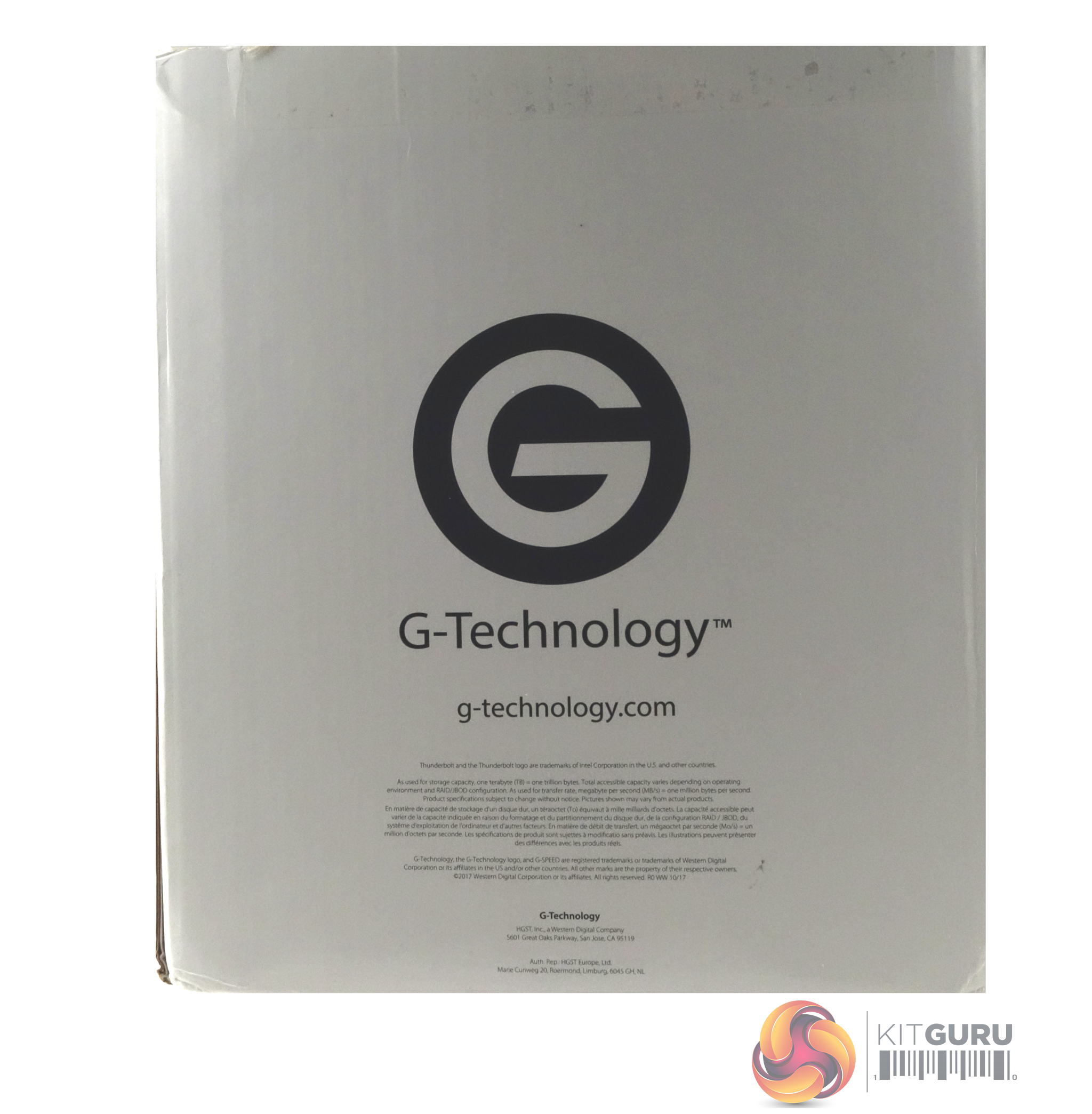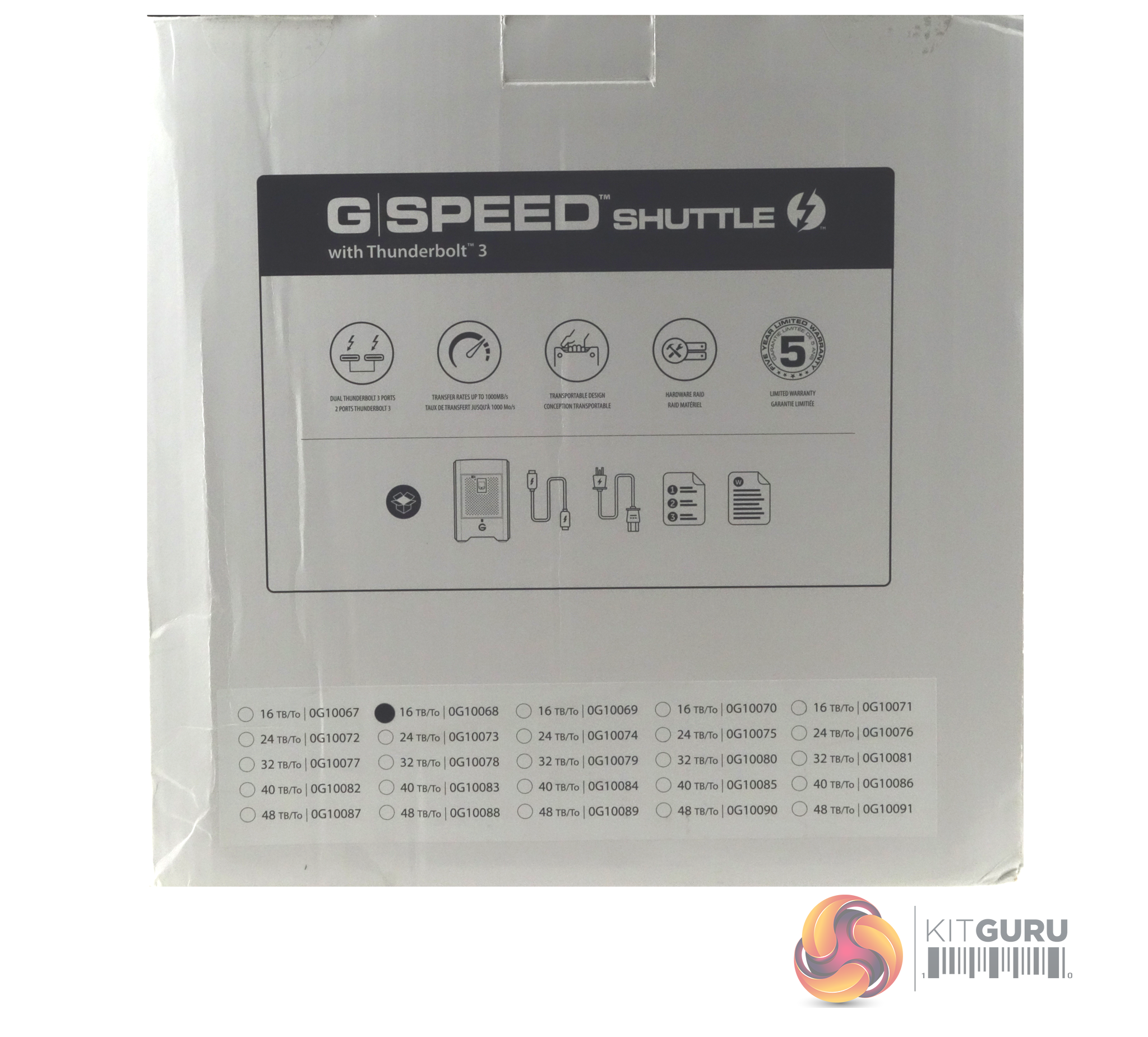 The G-Speed Shuttle comes in a sturdy box with a drawing of the unit on the front. The rear of the box has a display of icons showing some of its features; dual Thunderbolt 3 ports, 1,000MB/s transfer rate, transportable design, hardware RAID and the fact it's backed by a five year warranty.