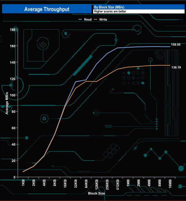 In our throughput tests, we could confirm and even better a little the official figures of 145MB/s for reads and 115MB/s for writes. Reads peaked at the 8MB block mark at 159.06MB/s before dropping back slightly to finish the test run at 158.95MB/s. Writes also peaked at the 8MB block mark at 136.31MB/s before finishing the test run at 136.19MB/s.