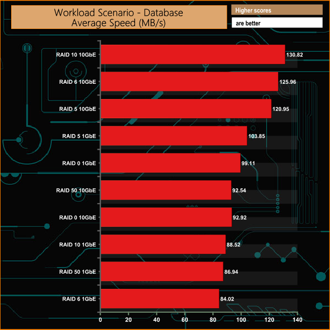 At 84.02MB/s the RAID 6 performance with a 1GbE connection is the slowest result in the Database workload. Run again using a 10GbE interface, the performance is bumped up some 41.94MB/s to 125.96MB/s, a 49.8% increase.