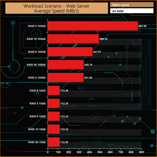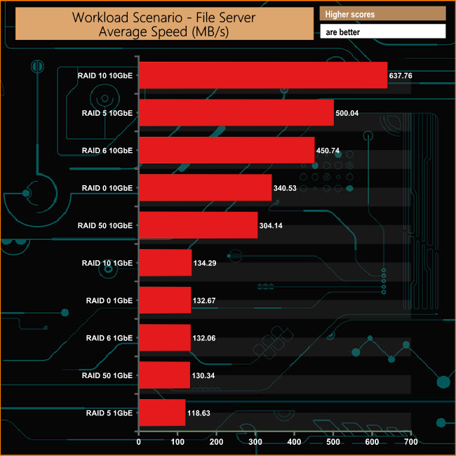 In the File Server workload test over a 1GbE connection, the TS-877 shows excellent consistency across all the arrays. Needless to say, the 10GbE performance is mightily impressive.