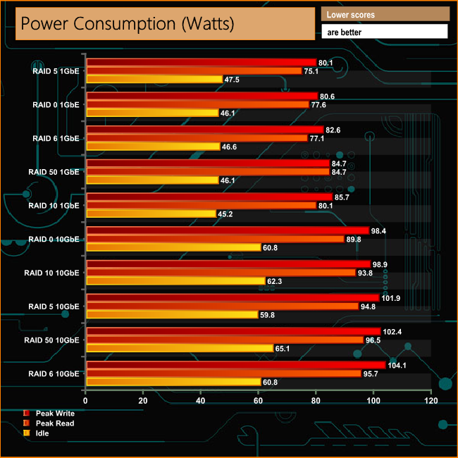 The AMD Ryzen 7 1700 has a TDP of 65W and with 16GB of system memory, the TS-877 is hardly going to be frugal with its power demands even with six power efficient drives in place when it is working as hard as it is during the read/write phases in this test.