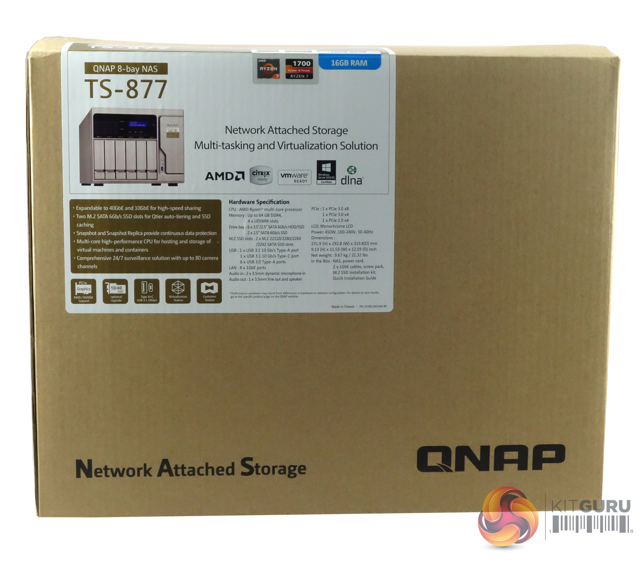 The TS-877 comes in a large box with a small but clear image of the unit on the front. Under the image are two information panels, the left hand one lists some of the NAS features while the one on the right displays the hardware specification.