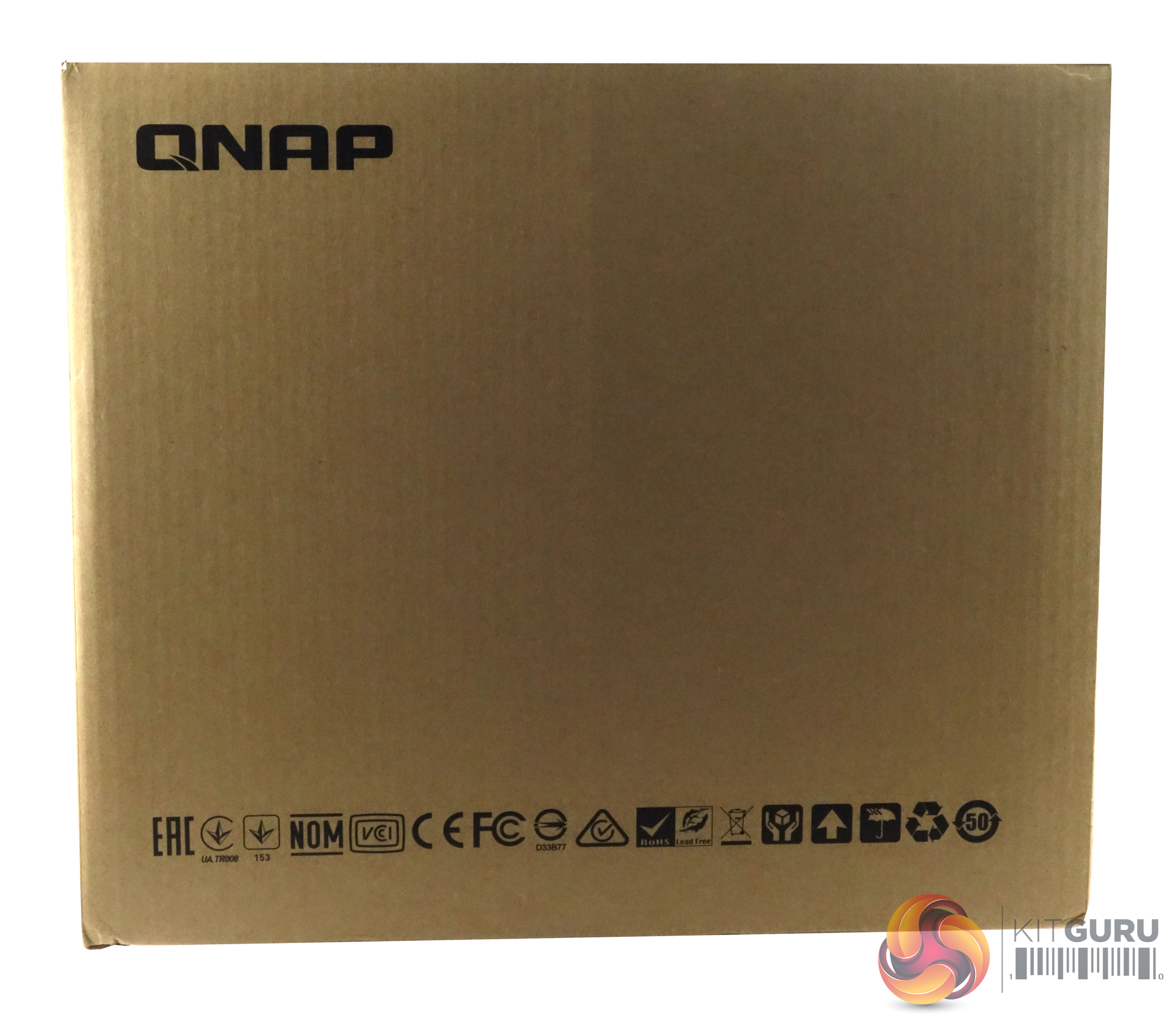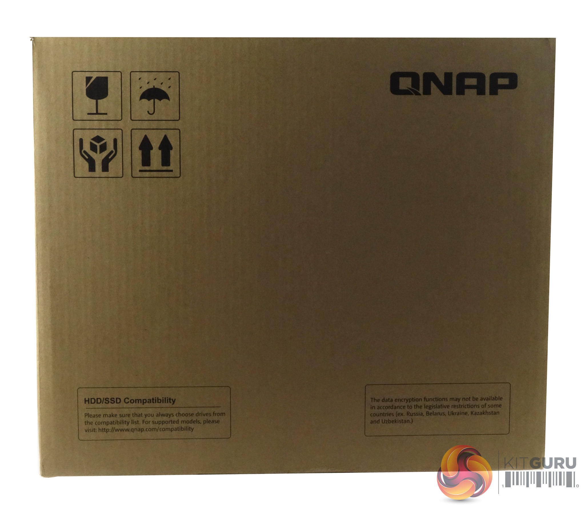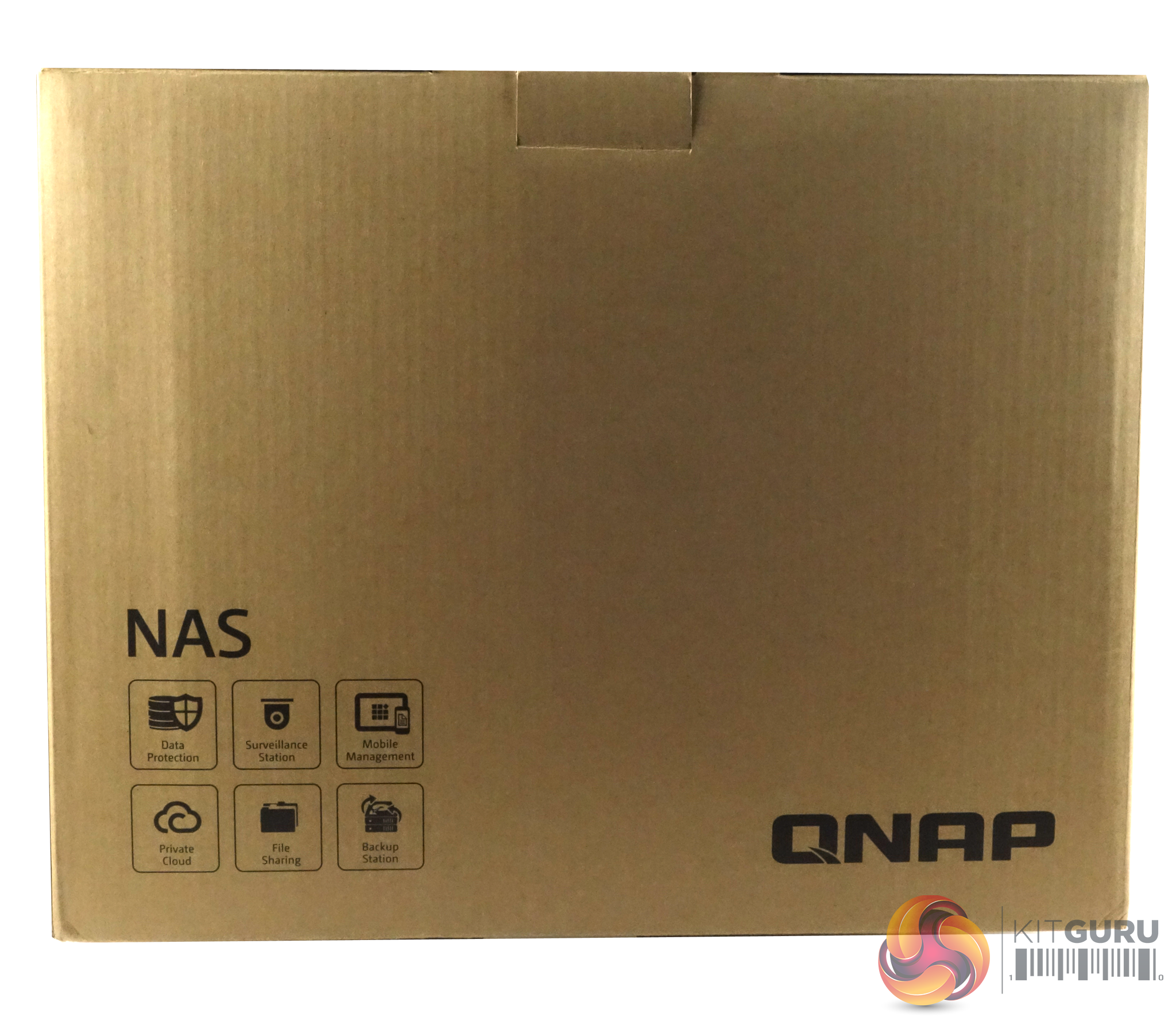 The rear of the box has a group of icons in the bottom left hand corner representing some of the QTS OS features; Data Protection, Surveillance Station, Mobile Management, Private Cloud, File Sharing and Backup Station.