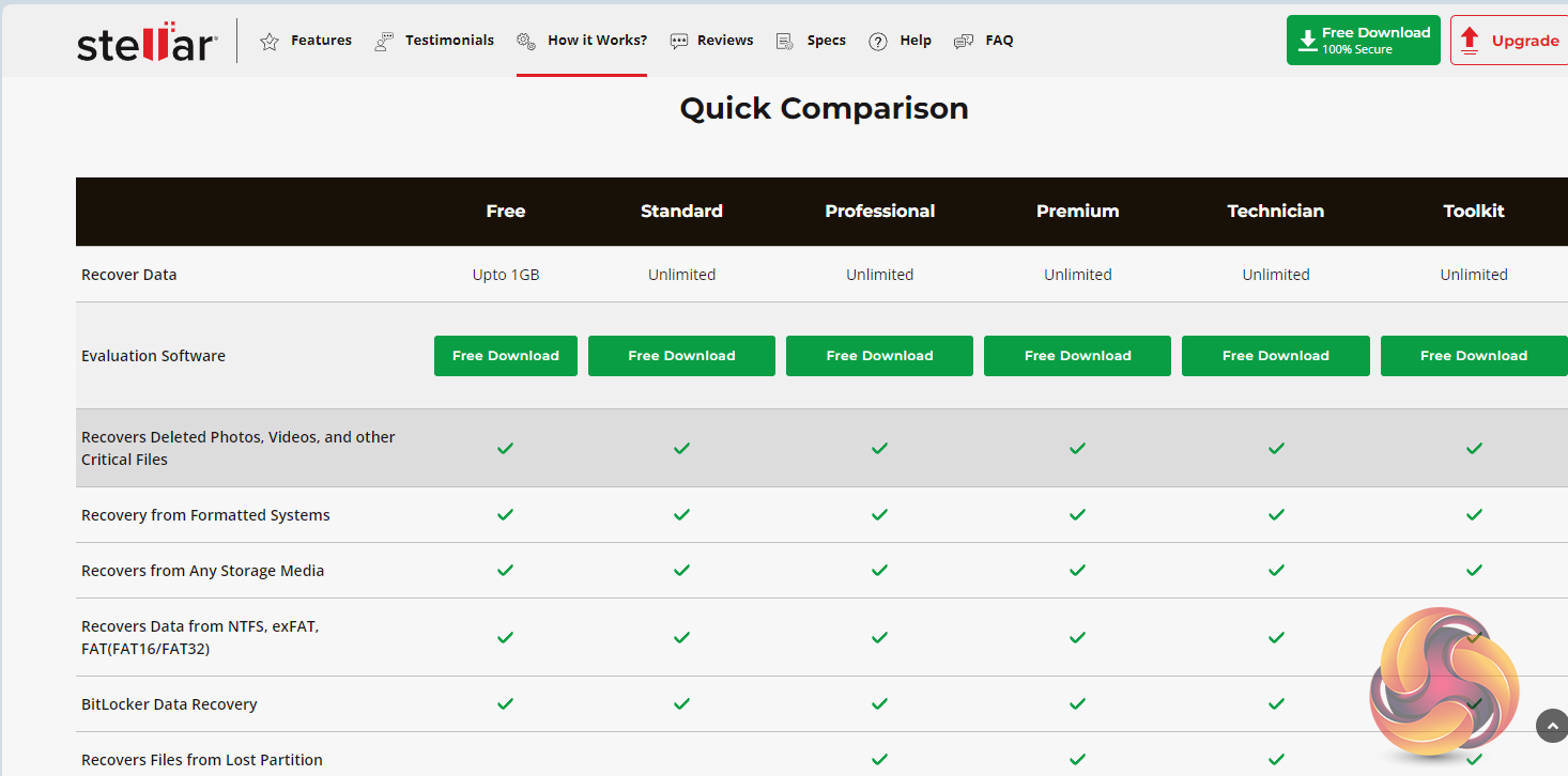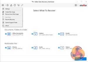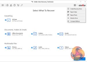 Stellar Data Recovery Technician only takes a few minutes to install. Once installed you are met by the main dashboard. Starting off with the top toolbar, to the left is a hamburger shortcut to a drop-down menu. Next, there is a shortcut to Create A Recovery drive. Then there is a microscope icon which is a link out to Stellar's Laboratory Services. The next two icons are links to Stellar's comprehensive Help webpage and their online shop. To the far right of the toolbar is a grid icon which is a shortcut to more tools.